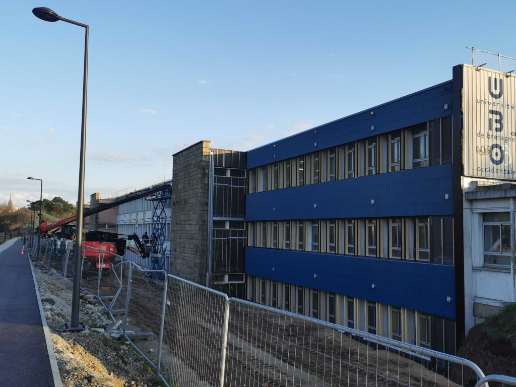 C’est ce qu’on appelle un aléa de chantier : alors que les diagnostics avant travaux avaient conclu à l’absence d’amiante, la dépose des premiers châssis vitrés a révélé l’inverse. Une mauvaise surprise qui aurait pu avoir un sérieux impact sur le coût et le délai de l’opération. Mais c’était sans compter sur la ténacité et l’adaptabilité des équipes du pôle Maîtrise d’ouvrage de la direction du Patrimoine ! Une solution fiable et sécurisée a ainsi émergé avec le recouvrement du dormant existant. Avantage : aucune dispersion de fibres et donc aucun risque d’exposition à l’amiante pour les usagers et usagères. De plus, une intégration au dossier technique amiante (DTA) de l’UBO permettra de réaliser un suivi rigoureux des installations. Faire face à cet impondérable aura nécessité près de deux mois de travail intense, mené en étroite collaboration avec la direction de l’UFR afin de se réorganiser au pied levé. Pour ne pas accumuler plus de retard, il a également été décidé de décorréler les travaux extérieurs et intérieurs : la façade progressera désormais à un rythme plus soutenu que les travaux intérieurs, ce qui devrait permettre de limiter le retard. Le chantier de la phase 1, qui couvre le tronçon le plus à l’ouest du bâtiment, se poursuivra jusqu’en mai, tandis qu’une partie de la phase 2 a d’ores et déjà démarré. La progression est d’ailleurs bien visible le long de l’avenue Le Gorgeu. Une bonne nouvelle à souligner pour les étudiantes, étudiants et personnels de l’UFR : toutes les ferrures, destinées à accueillir les murs en ossature bois, ont été posées sur la totalité du bâtiment. Cette opération, assez bruyante, est donc désormais derrière nous.